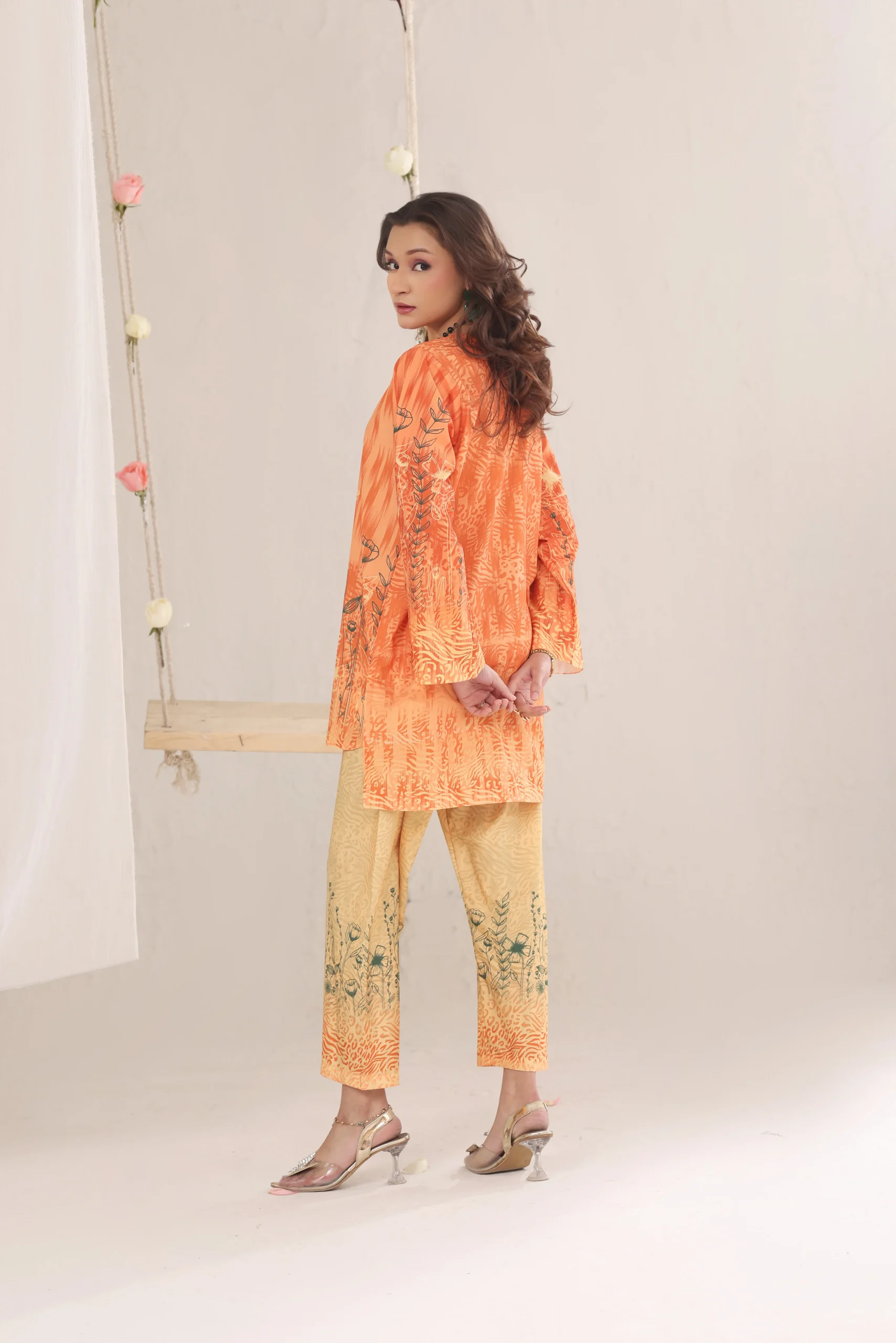 This striking orange ensemble features intricate botanical prints layered over a fluid, elongated cut. The wide sleeves enhance movement while adding a soft, dramatic touch. Subtle detailing around the neckline refines the overall composition. Paired with light toned trousers, it creates a balanced and radiant seasonal statement.Additional information